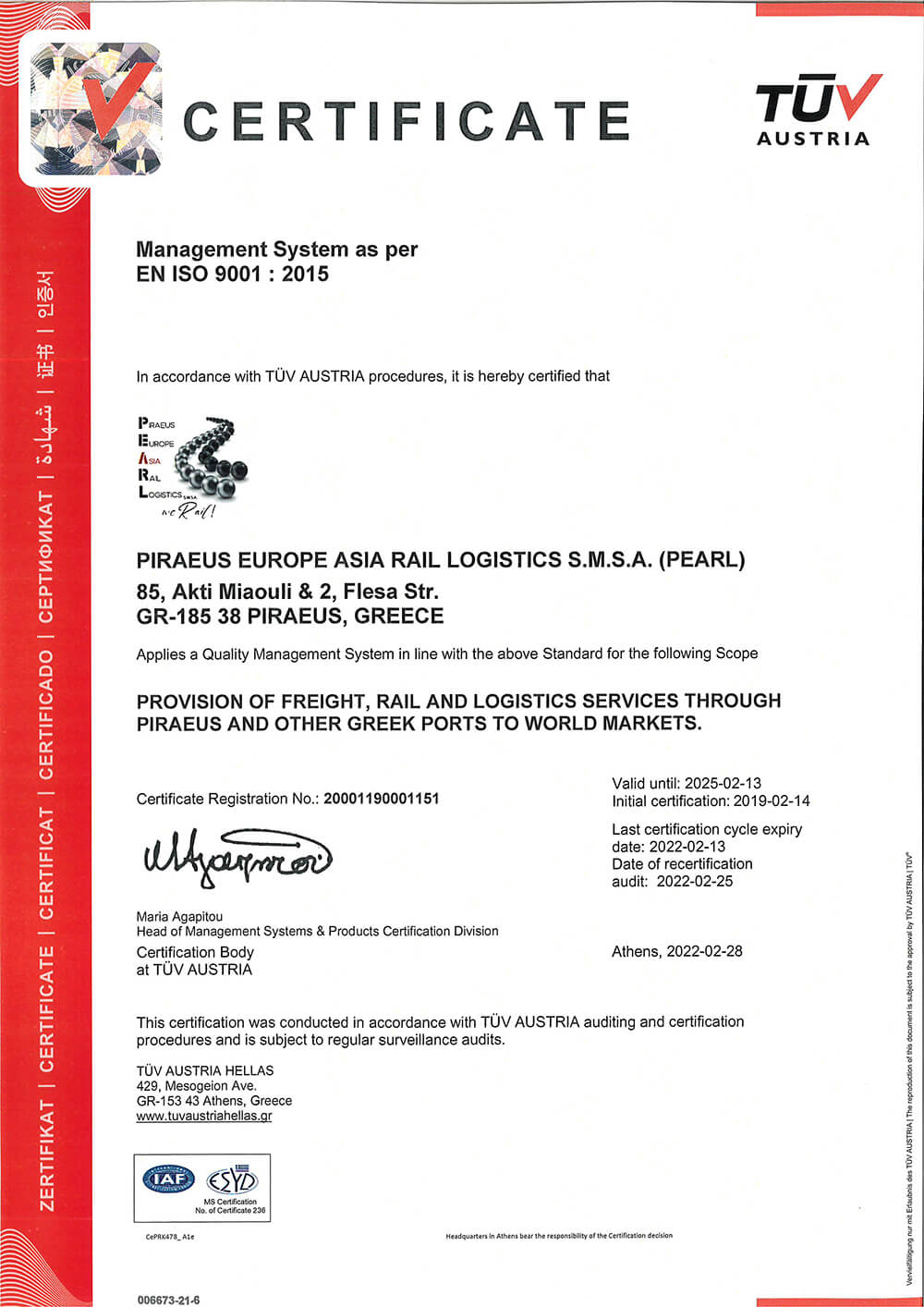 PEARL SMSA has successfully completed its re-certification on Quality Management System for the provision of Rail freight forwarding services, in accordance with the international standards set out by EN ISO 9001: 2015, following the inspection of the Certifying Body of TÜV Austria Hellas.