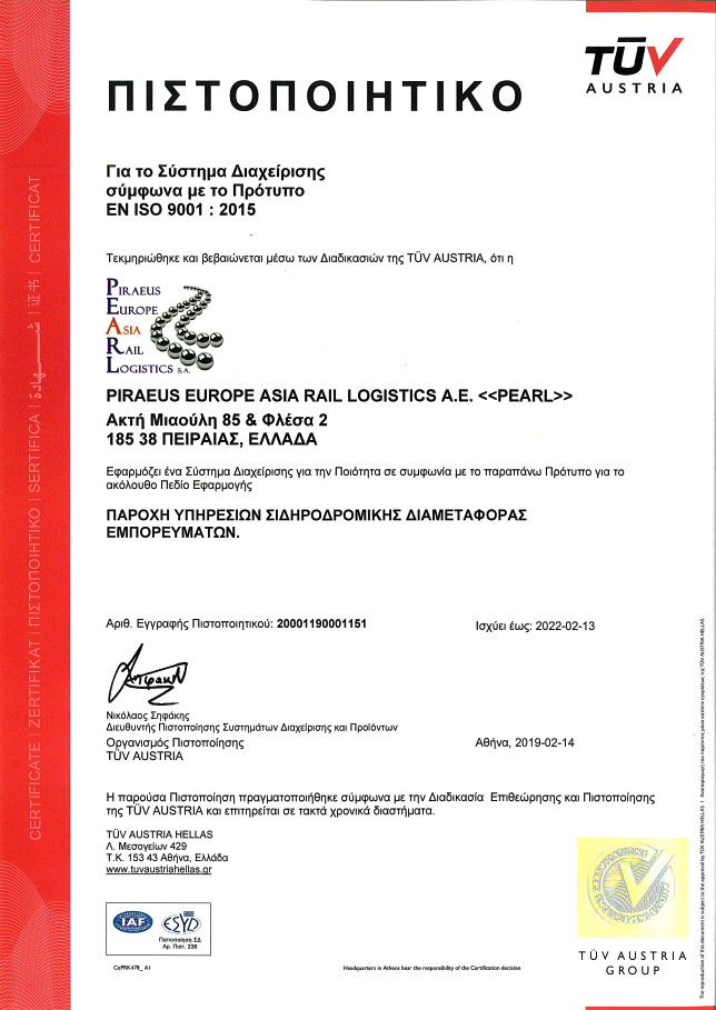 Η PEARL Α.Ε. ολοκλήρωσε με απόλυτη επιτυχία την πιστοποίηση της και εφαρμόζει Σύστημα Διαχείρισης Ποιότητας Παροχής Υπηρεσιών Σιδηροδρομικής Διαμεταφοράς Εμπορευμάτων, σύμφωνα με το διεθνές πρότυπο ΕΝ ISO 9001:2015, μετά από επιθεώρηση από τον Οργανισμό Πιστοποίησης TÜV Austria Hellas.